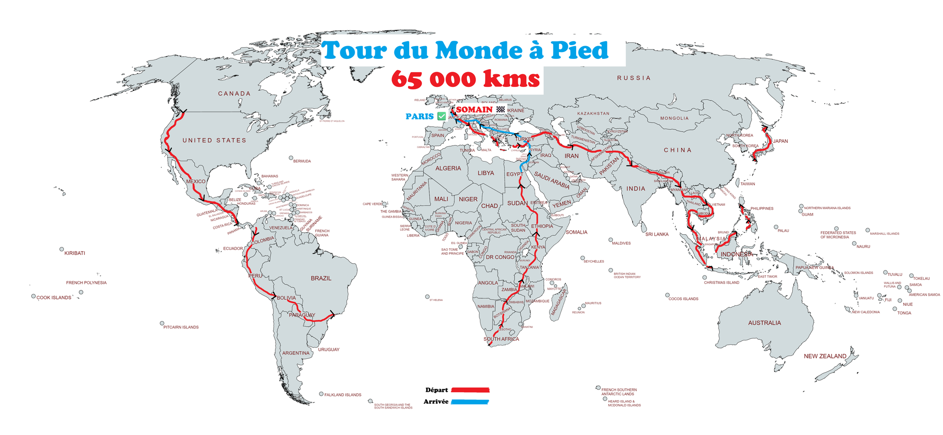 Chaque voyage requiert son itinéraire. Plus de 65 000 kms de randonnée à travers le monde à traverser tous les environnements et paysages imaginables. Ce tour du monde nous amènera à traverser déserts, montagnes, rizières, forêts et bien plus encore... Alors n'hésitez pas à aller jeter un coup d'œil à la carte du périple !